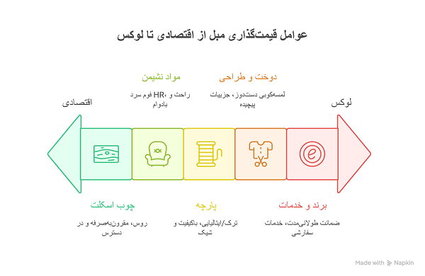 واقعیت این است که یک عدد ثابت وجود ندارد؛ قیمت نهایی تابع «ترکیب متریال + کیفیت ساخت + ابعاد/تعداد نشیمن + برند/گارانتی» است. برای تصمیم دقیق، این فاکتورها را بسنجید:
